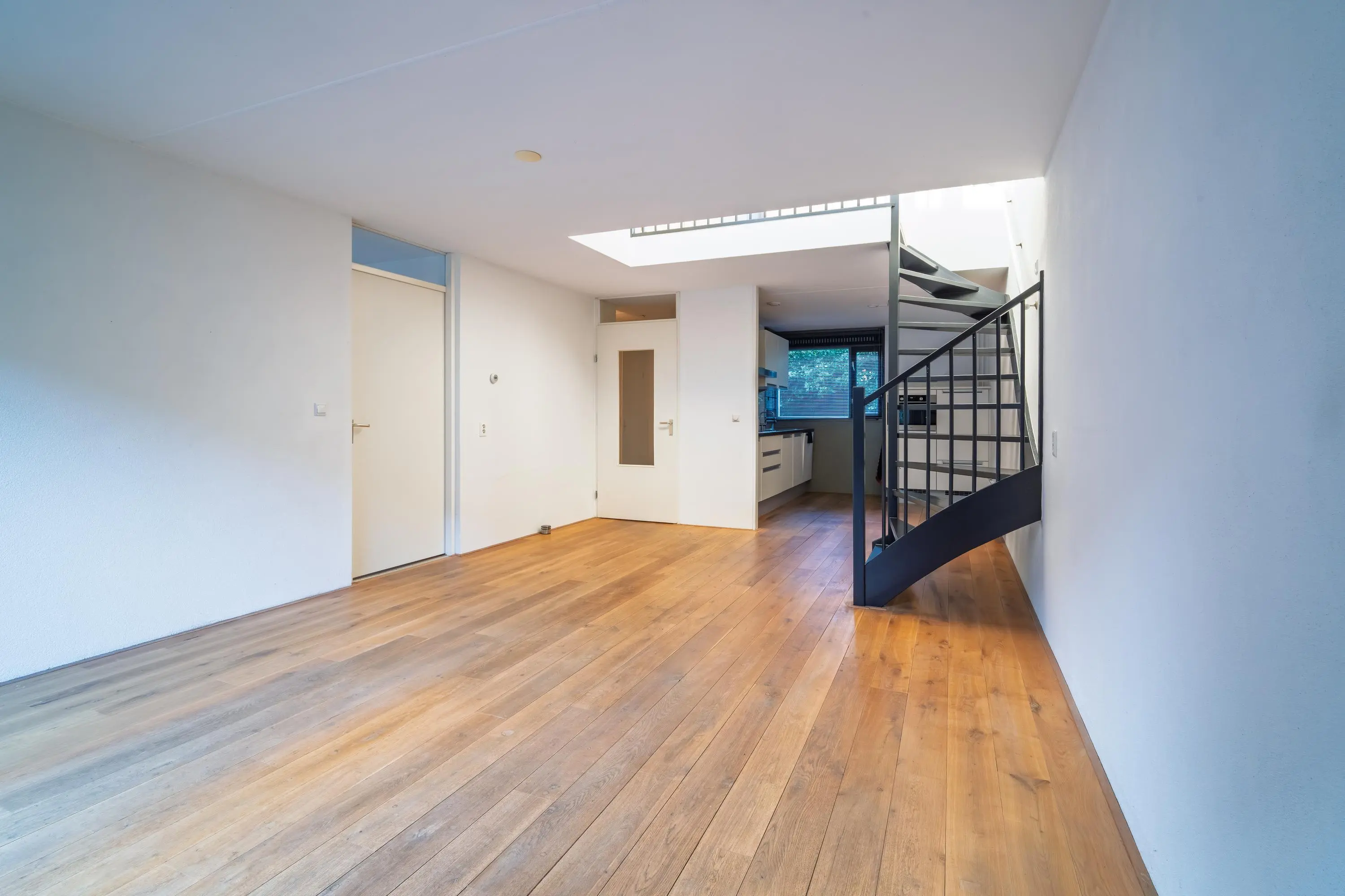 Via de ruime entree betreed je de woning, waar direct de prettige en praktische indeling opvalt. Vanuit de hal zijn het toilet, de inpandige berging en de woonkamer bereikbaar. De woonkamer van circa 27 m² vormt een comfortabele leefruimte met volop mogelijkheden voor een gezellige zithoek en eettafel. Dankzij de schuifpui naar de achtertuin valt het daglicht rijkelijk naar binnen en ontstaat er een fijne verbinding tussen binnen en buiten. De open keuken sluit hier naadloos op aan en heeft een moderne, frisse uitstraling met witte kastfronten en diverse inbouwapparatuur.