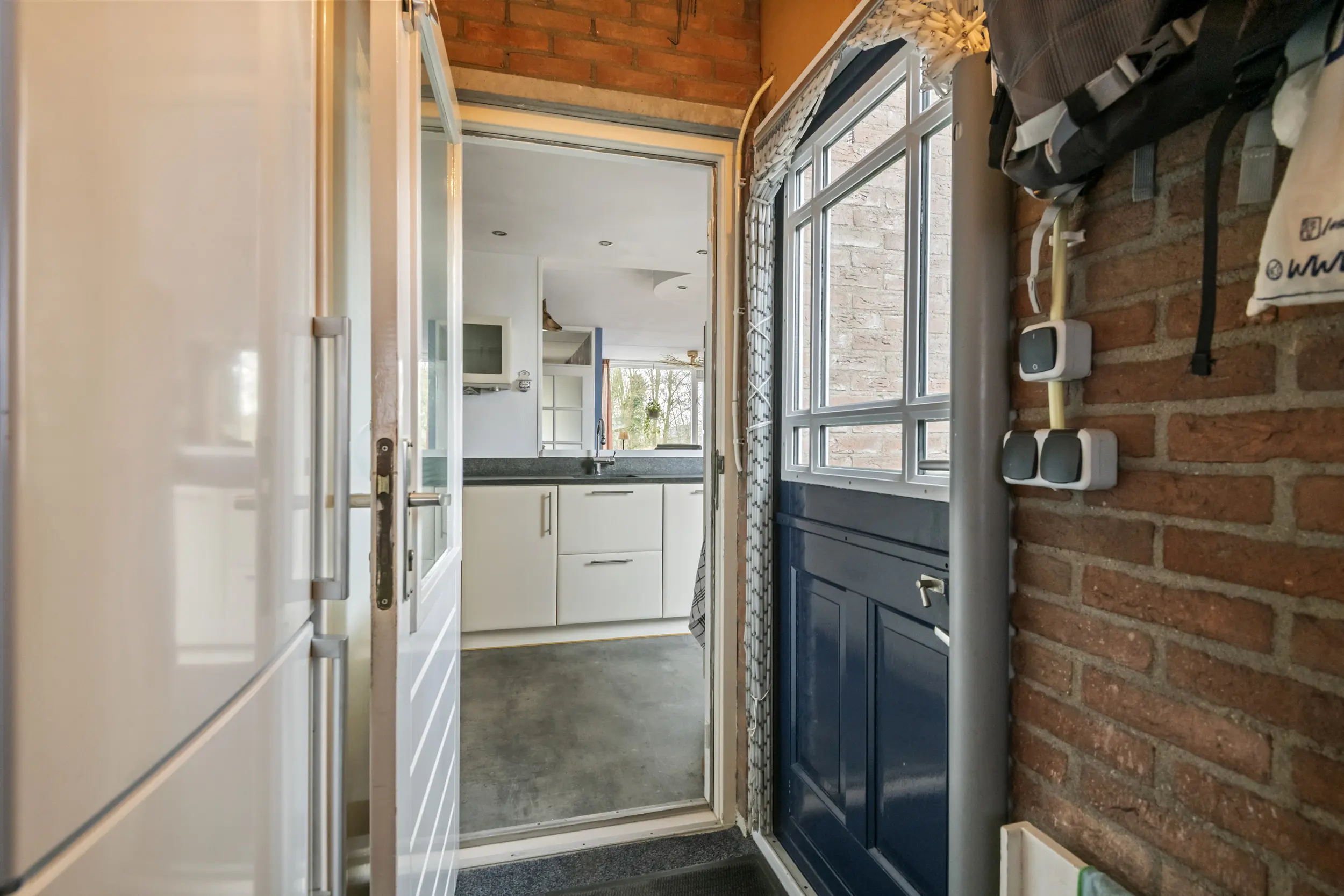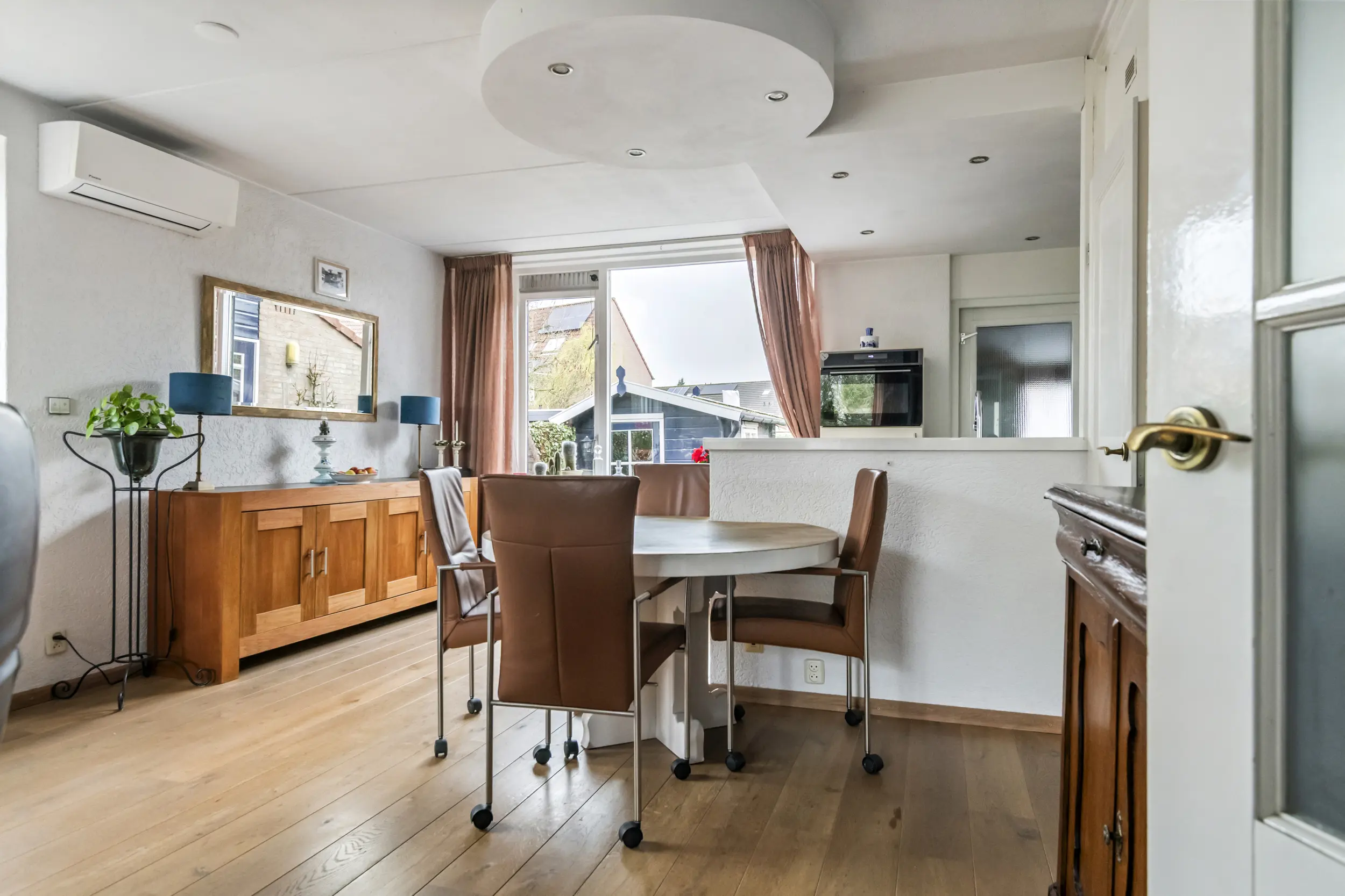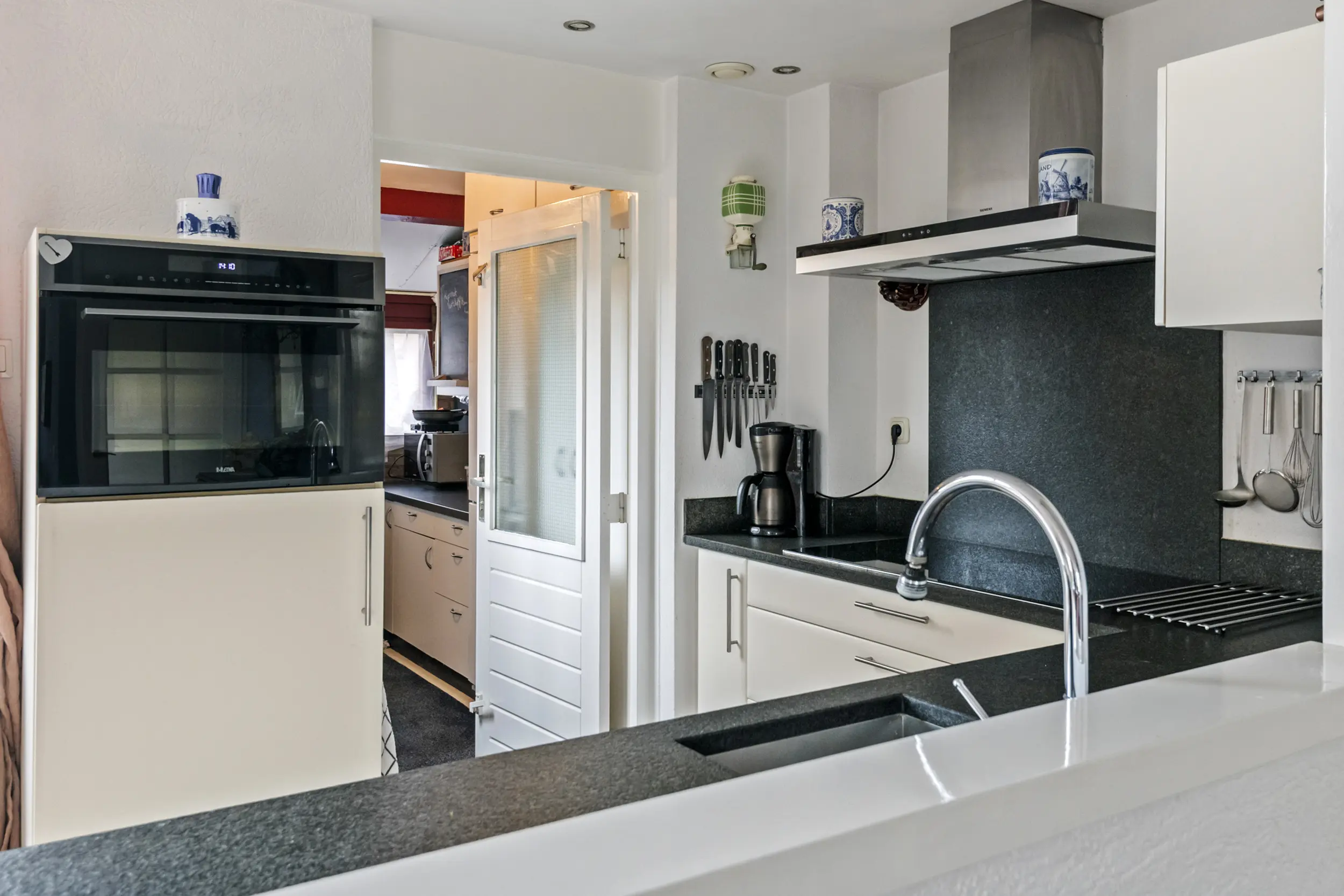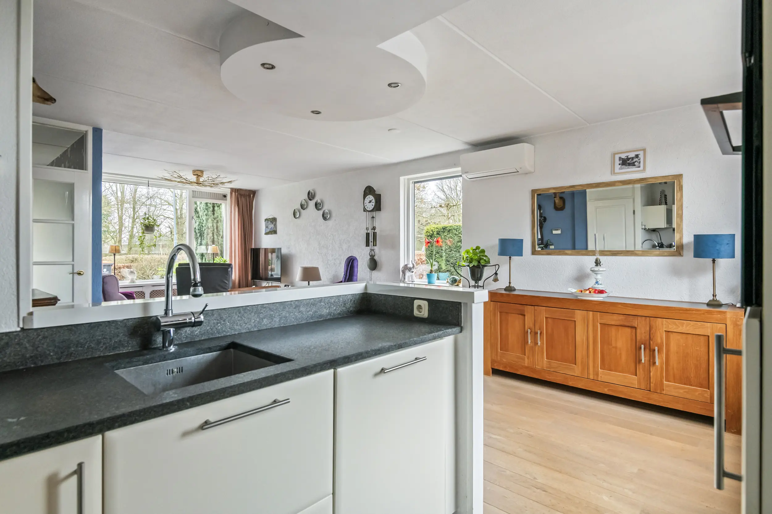 Via de entree komt u in de hal met toegang tot het toilet, de meterkast, de trapopgang naar de verdieping en de woonkamer. De woonkamer is ruim en licht en vormt samen met de open keuken een prettige leefruimte. Daarnaast is de woonkamer voorzien van airconditioning voor koelen en verwarmen, wat zorgt voor extra comfort tijdens warme zomerdagen en koude winterdagen . Aan de achterkant van de woning bevindt zich de open keuken. Deze beschikt over een donker hardstenen werkblad, een 5-pits Bosch inductiekookplaat, vaatwasser en voldoende kastruimte. Aansluitend bevindt zich een praktische bijkeuken. Deze ruimte was oorspronkelijk in gebruik als schuur, maar wordt momenteel gebruikt als extra bergruimte en verlengstuk van de keuken.