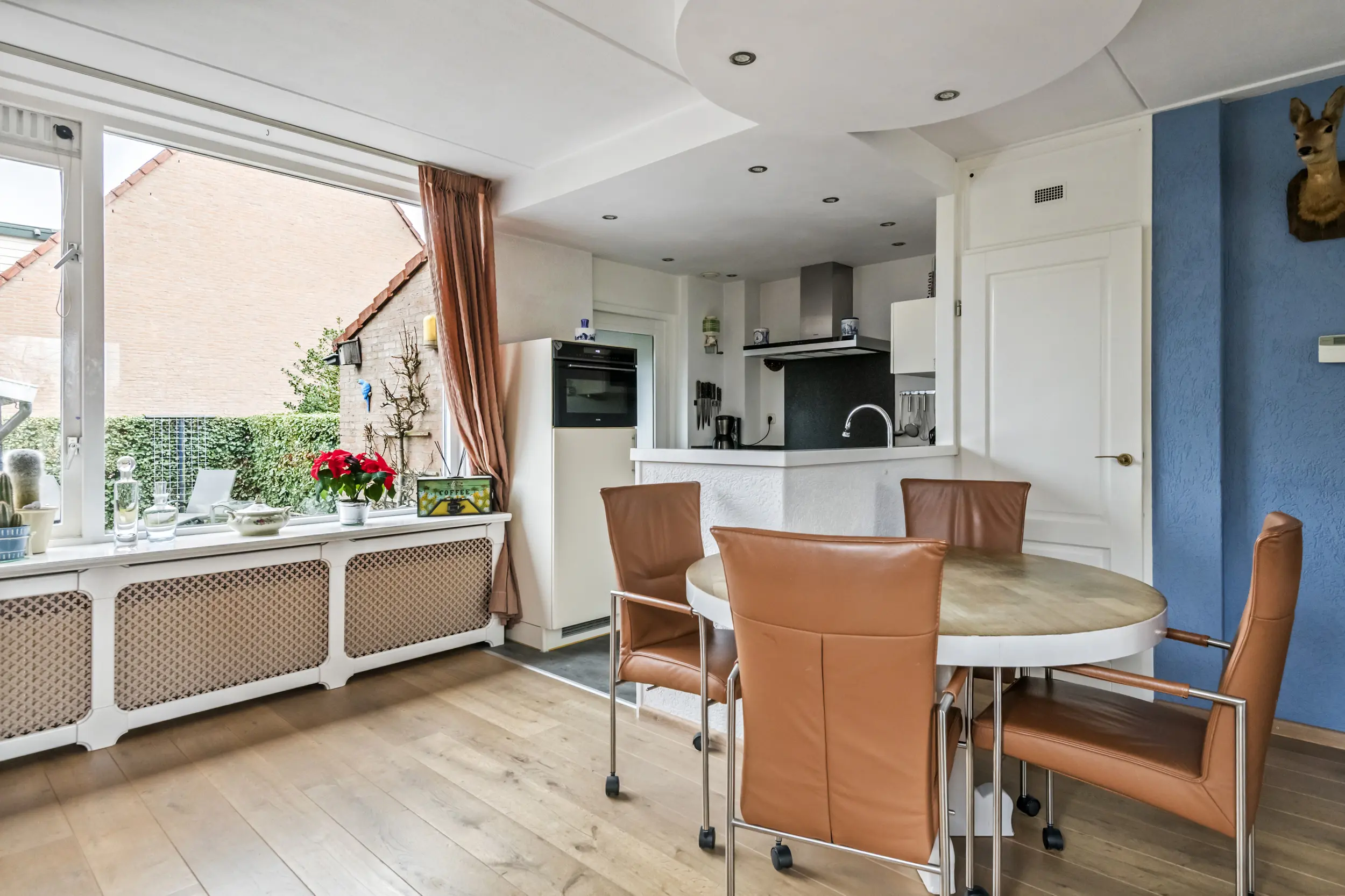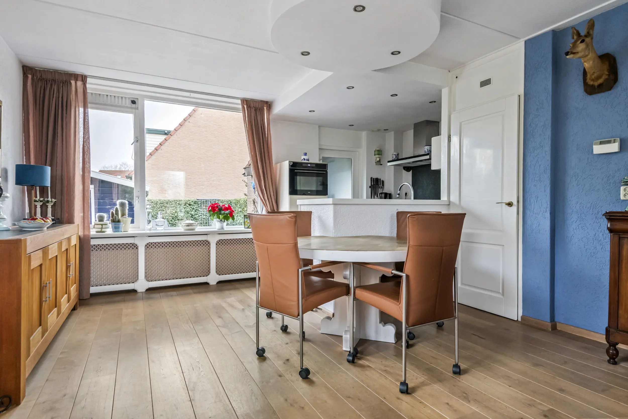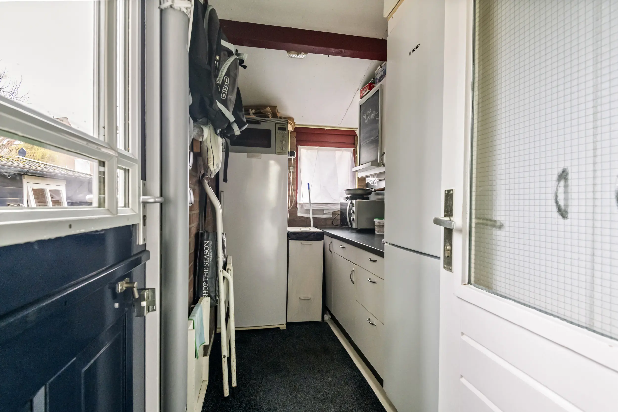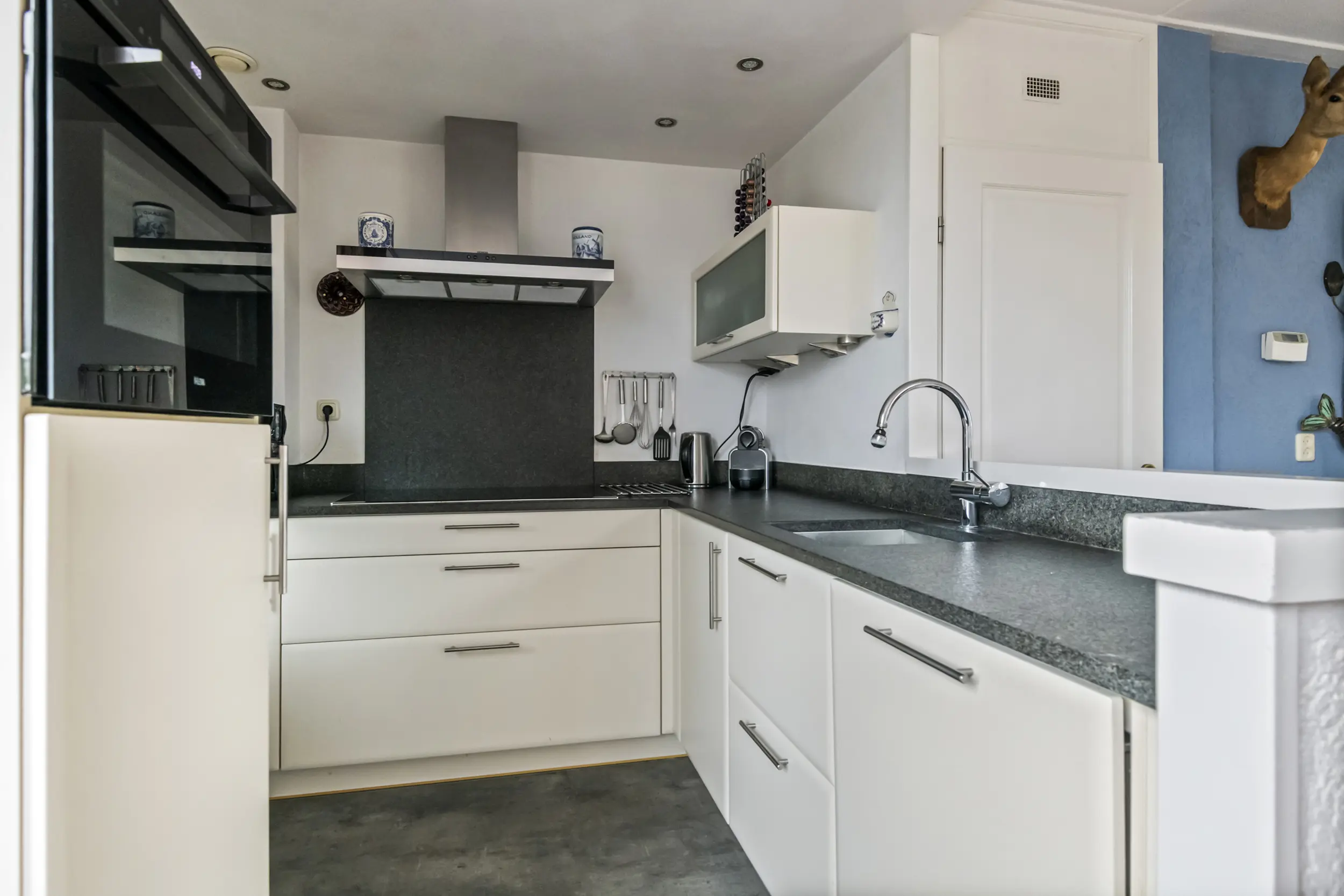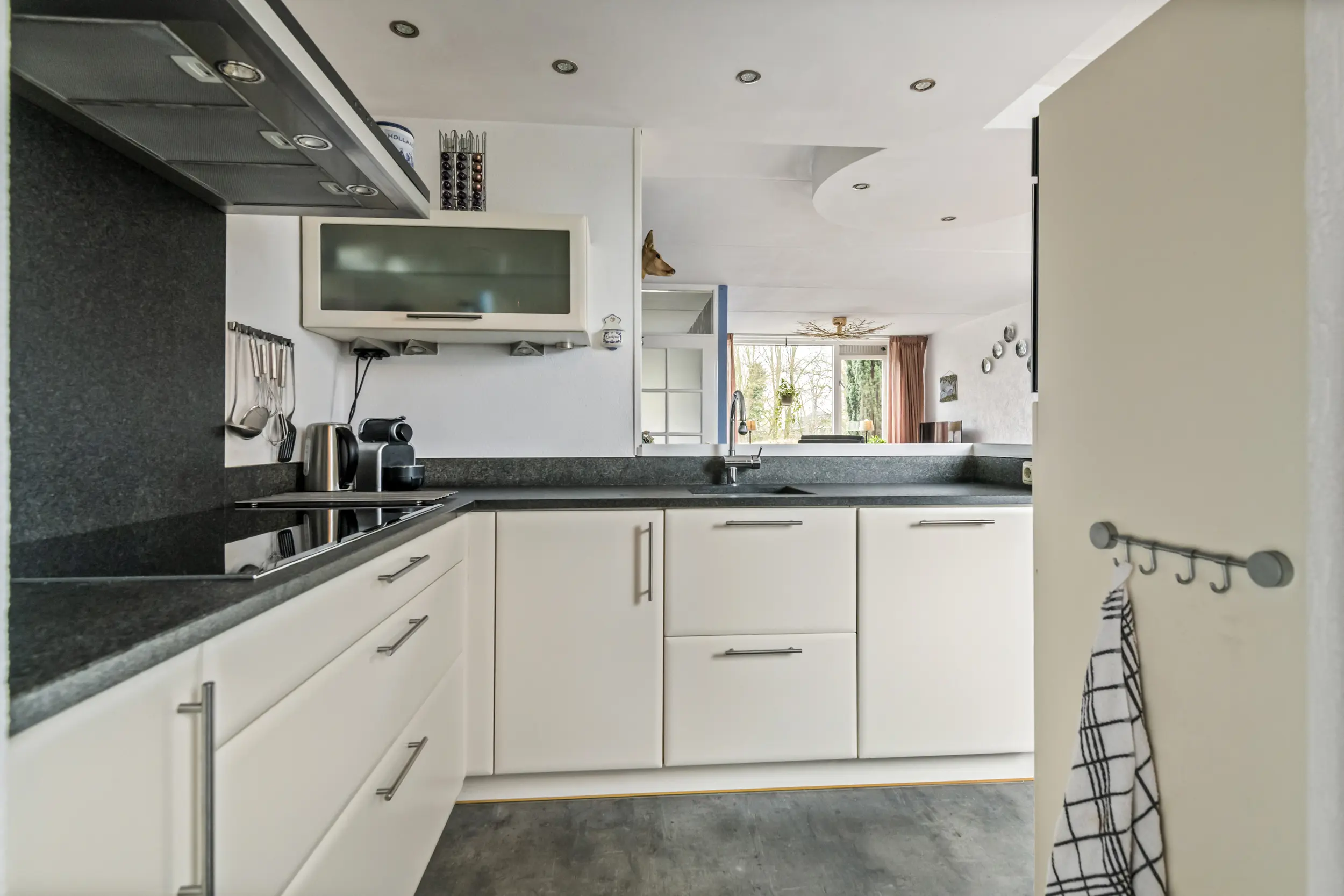 Via de entree komt u in de hal met toegang tot het toilet, de meterkast, de trapopgang naar de verdieping en de woonkamer. De woonkamer is ruim en licht en vormt samen met de open keuken een prettige leefruimte. Daarnaast is de woonkamer voorzien van airconditioning voor koelen en verwarmen, wat zorgt voor extra comfort tijdens warme zomerdagen en koude winterdagen . Aan de achterkant van de woning bevindt zich de open keuken. Deze beschikt over een donker hardstenen werkblad, een 5-pits Bosch inductiekookplaat, vaatwasser en voldoende kastruimte. Aansluitend bevindt zich een praktische bijkeuken. Deze ruimte was oorspronkelijk in gebruik als schuur, maar wordt momenteel gebruikt als extra bergruimte en verlengstuk van de keuken.
