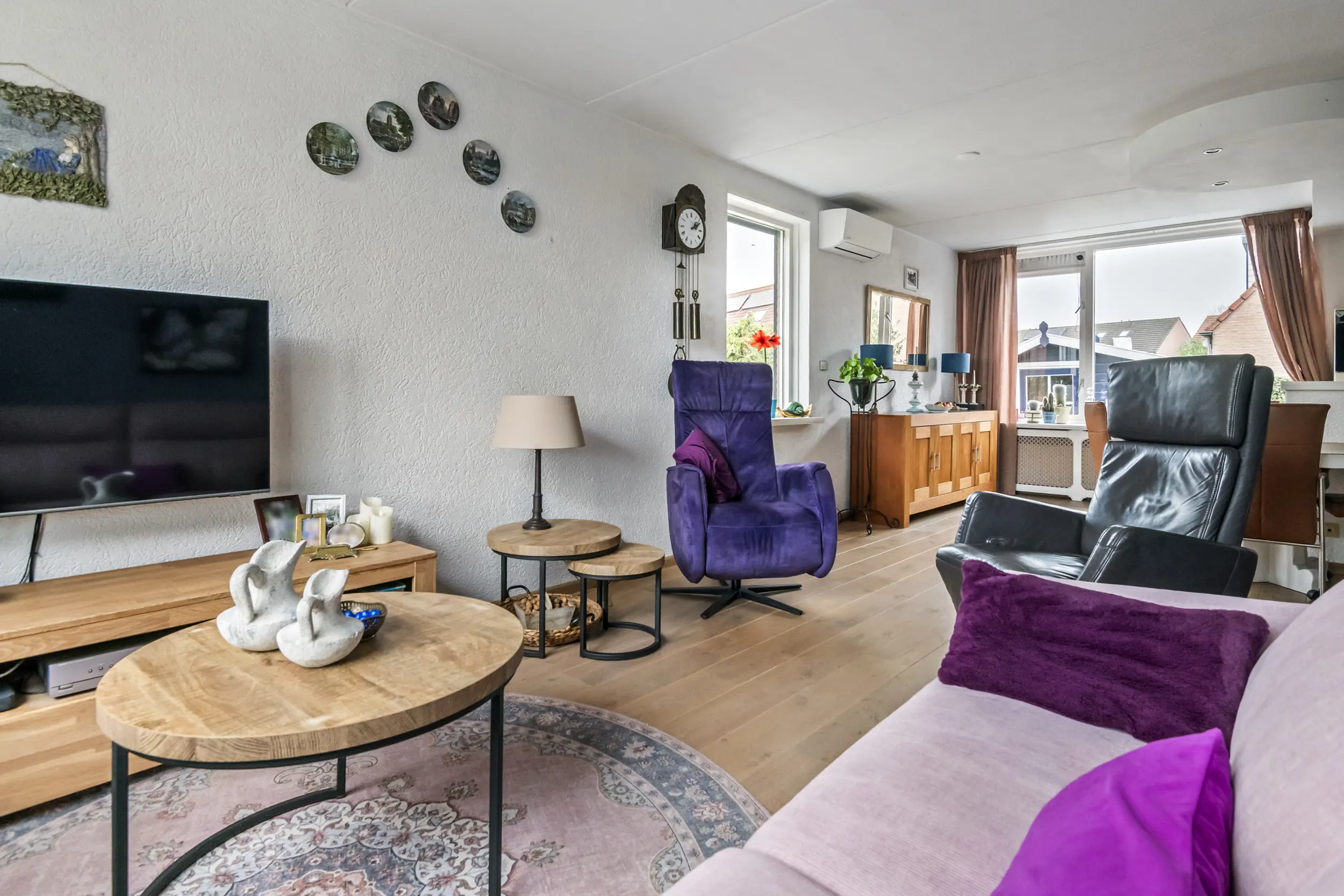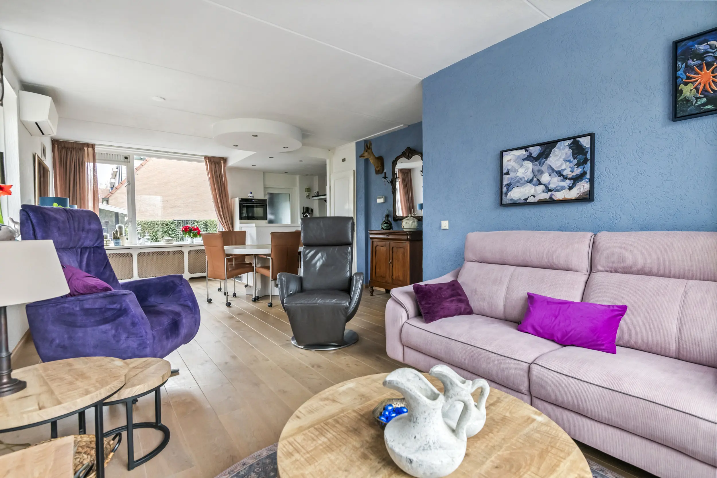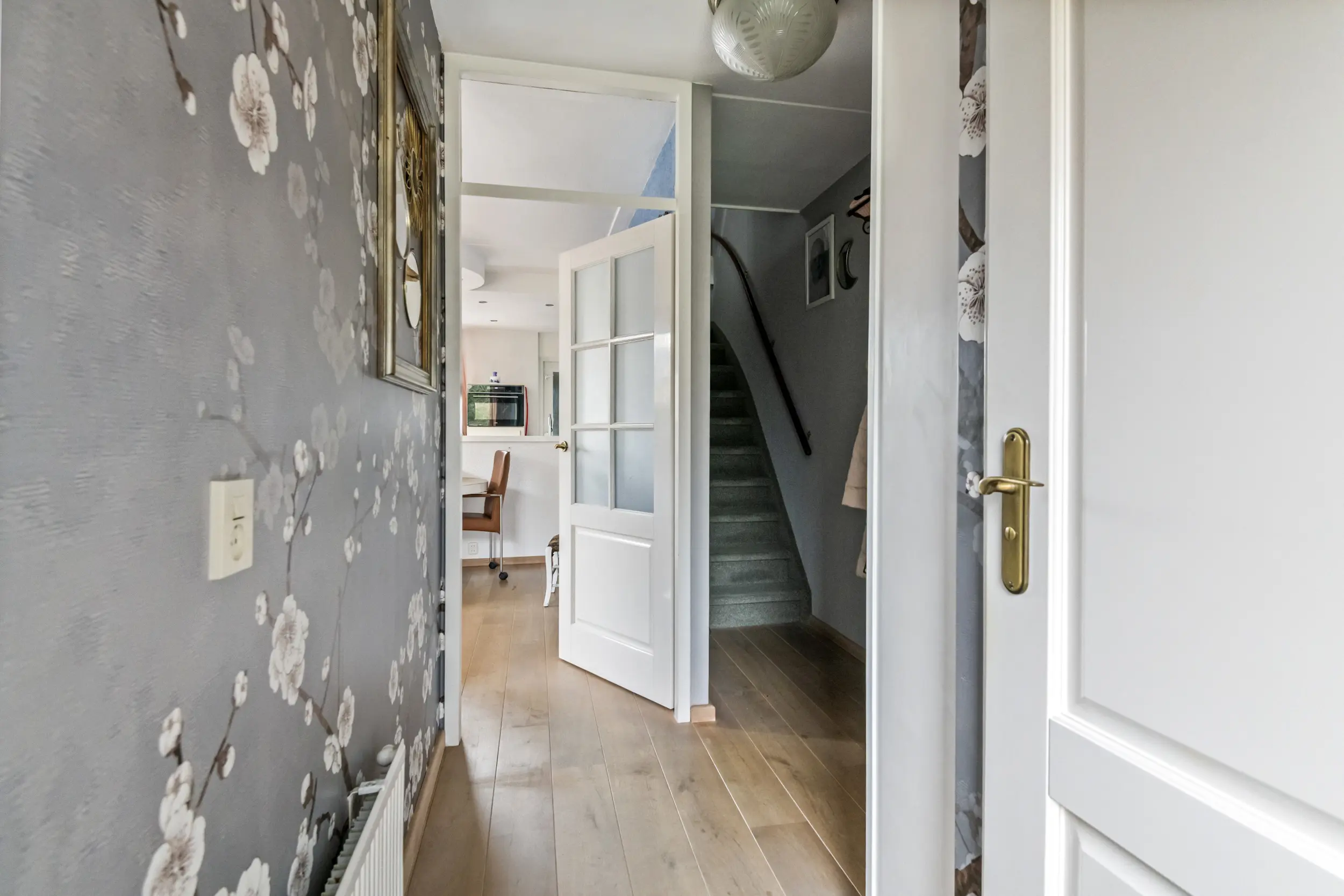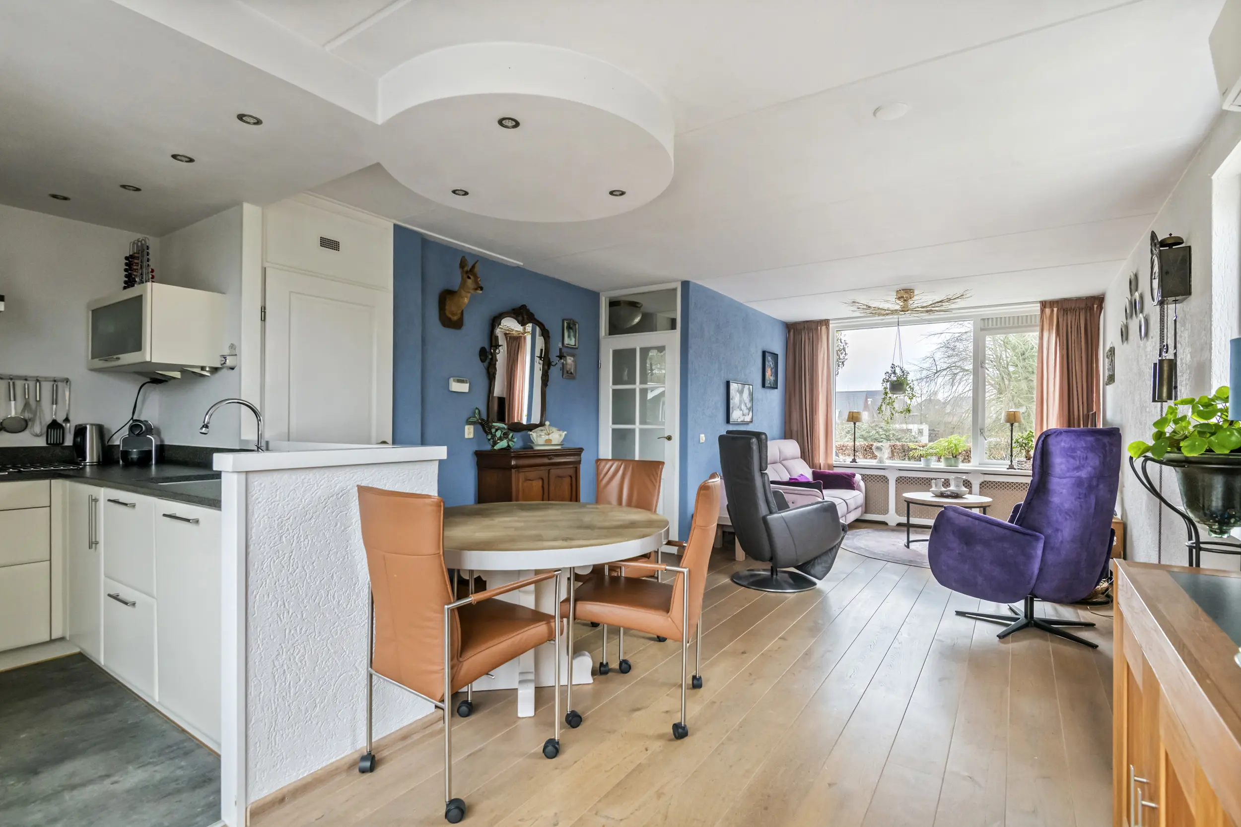 Via de entree komt u in de hal met toegang tot het toilet, de meterkast, de trapopgang naar de verdieping en de woonkamer. De woonkamer is ruim en licht en vormt samen met de open keuken een prettige leefruimte. Daarnaast is de woonkamer voorzien van airconditioning voor koelen en verwarmen, wat zorgt voor extra comfort tijdens warme zomerdagen en koude winterdagen . Aan de achterkant van de woning bevindt zich de open keuken. Deze beschikt over een donker hardstenen werkblad, een 5-pits Bosch inductiekookplaat, vaatwasser en voldoende kastruimte. Aansluitend bevindt zich een praktische bijkeuken. Deze ruimte was oorspronkelijk in gebruik als schuur, maar wordt momenteel gebruikt als extra bergruimte en verlengstuk van de keuken.
