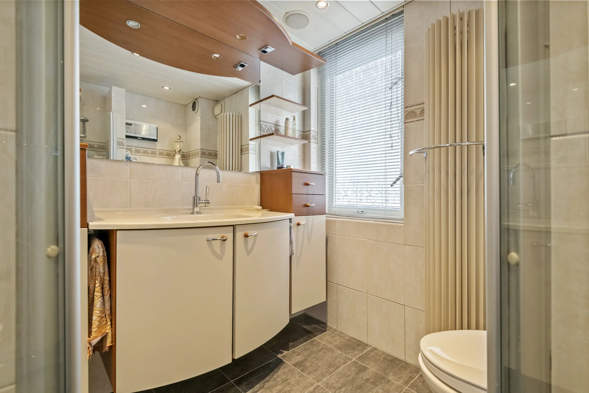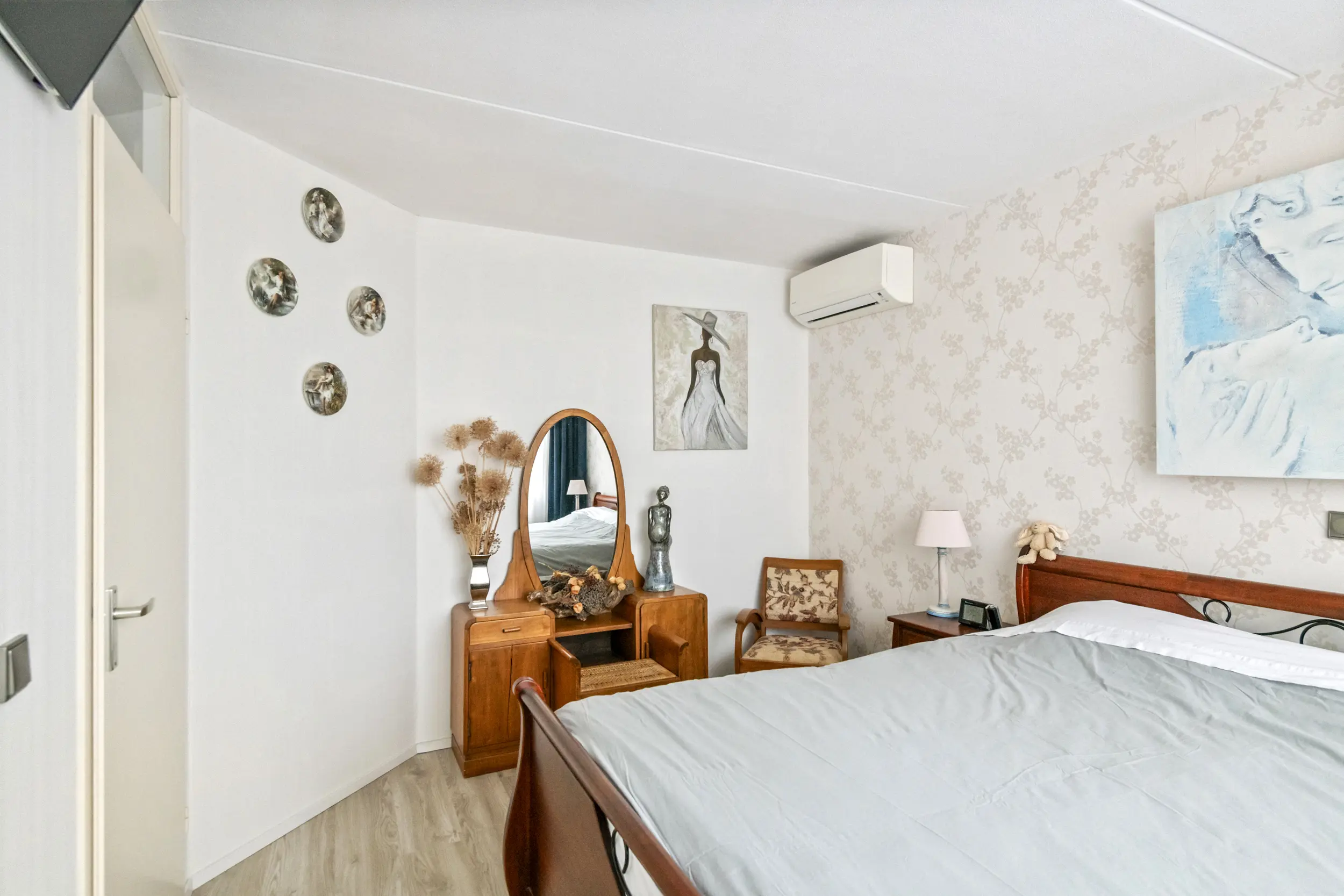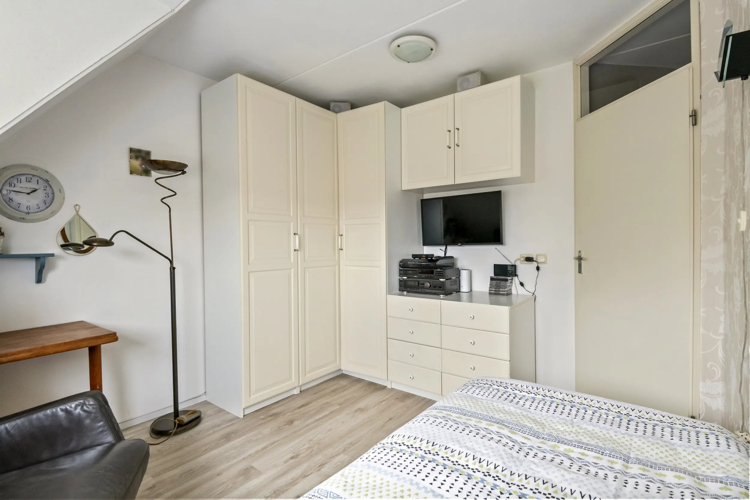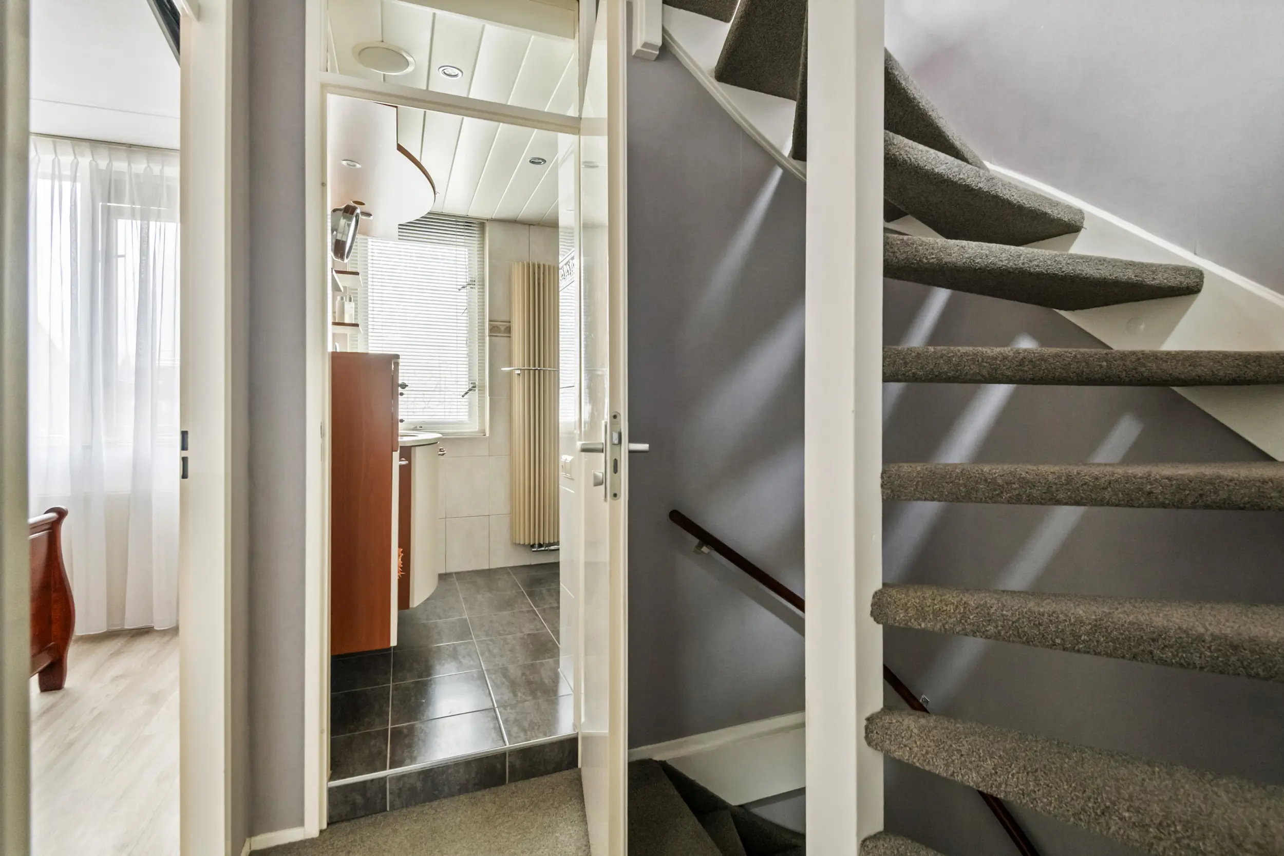 Op de eerste verdieping bevinden zich drie slaapkamers en de badkamer. De grootste slaapkamer ligt aan de achterzijde van de woning en is eveneens voorzien van airconditioning. Aan de voorzijde bevinden zich twee slaapkamers. Dankzij de aanwezige dakkapel zijn ook deze kamers goed van formaat en geschikt als slaap-, werk- of hobbykamer. De badkamer is compleet uitgevoerd met een douche, wastafelmeubel, radiator en een zwevend toilet. De ruimte is netjes onderhouden en praktisch ingericht. Tegelijkertijd biedt deze ruimte volop mogelijkheden om deze in de toekomst naar eigen smaak te moderniseren.