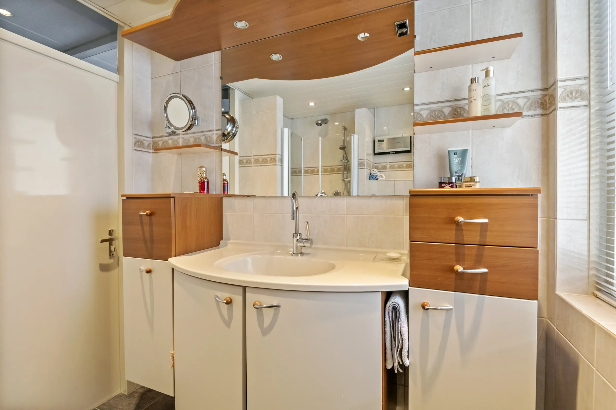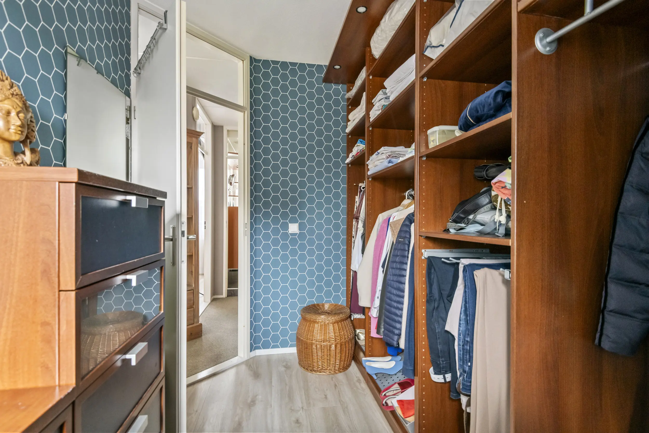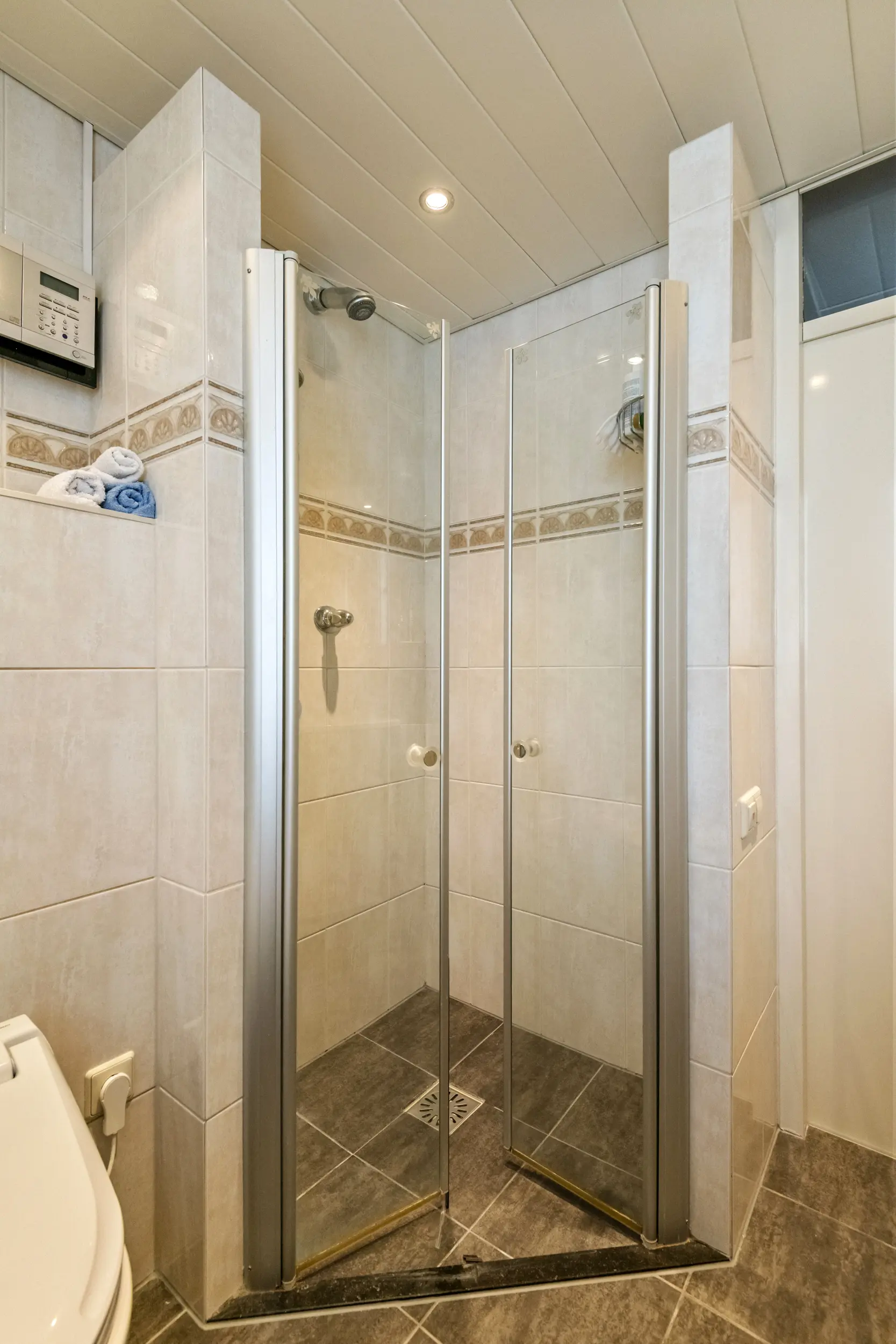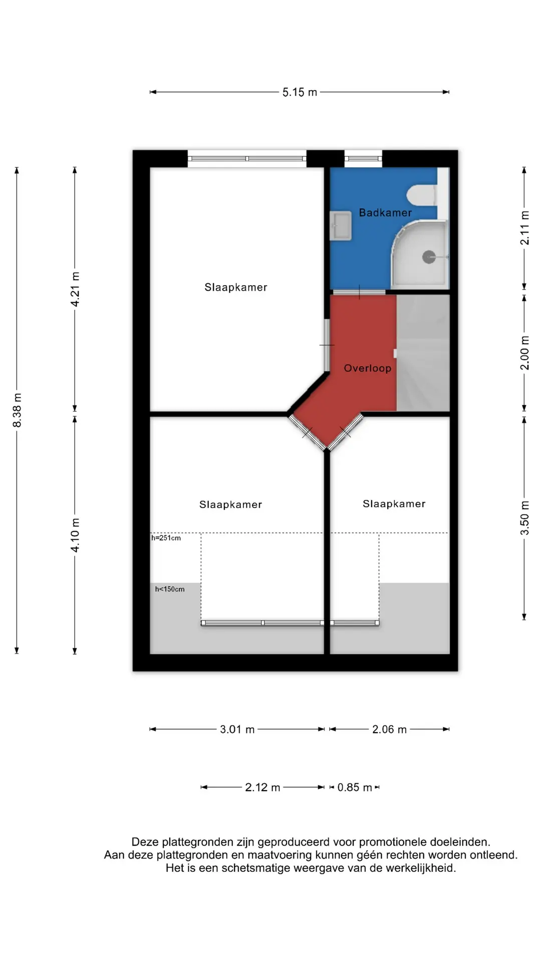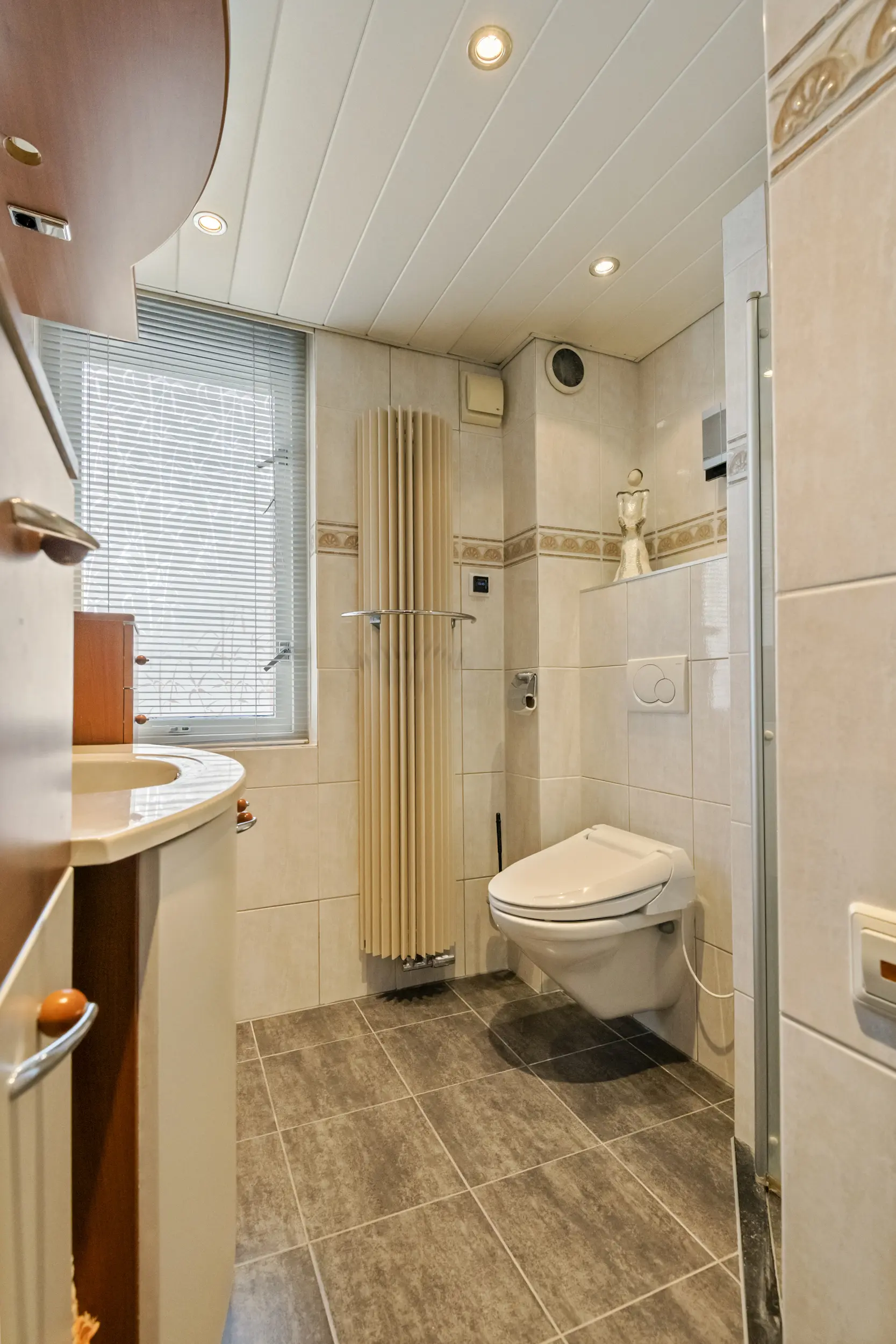 Op de eerste verdieping bevinden zich drie slaapkamers en de badkamer. De grootste slaapkamer ligt aan de achterzijde van de woning en is eveneens voorzien van airconditioning. Aan de voorzijde bevinden zich twee slaapkamers. Dankzij de aanwezige dakkapel zijn ook deze kamers goed van formaat en geschikt als slaap-, werk- of hobbykamer. De badkamer is compleet uitgevoerd met een douche, wastafelmeubel, radiator en een zwevend toilet. De ruimte is netjes onderhouden en praktisch ingericht. Tegelijkertijd biedt deze ruimte volop mogelijkheden om deze in de toekomst naar eigen smaak te moderniseren.