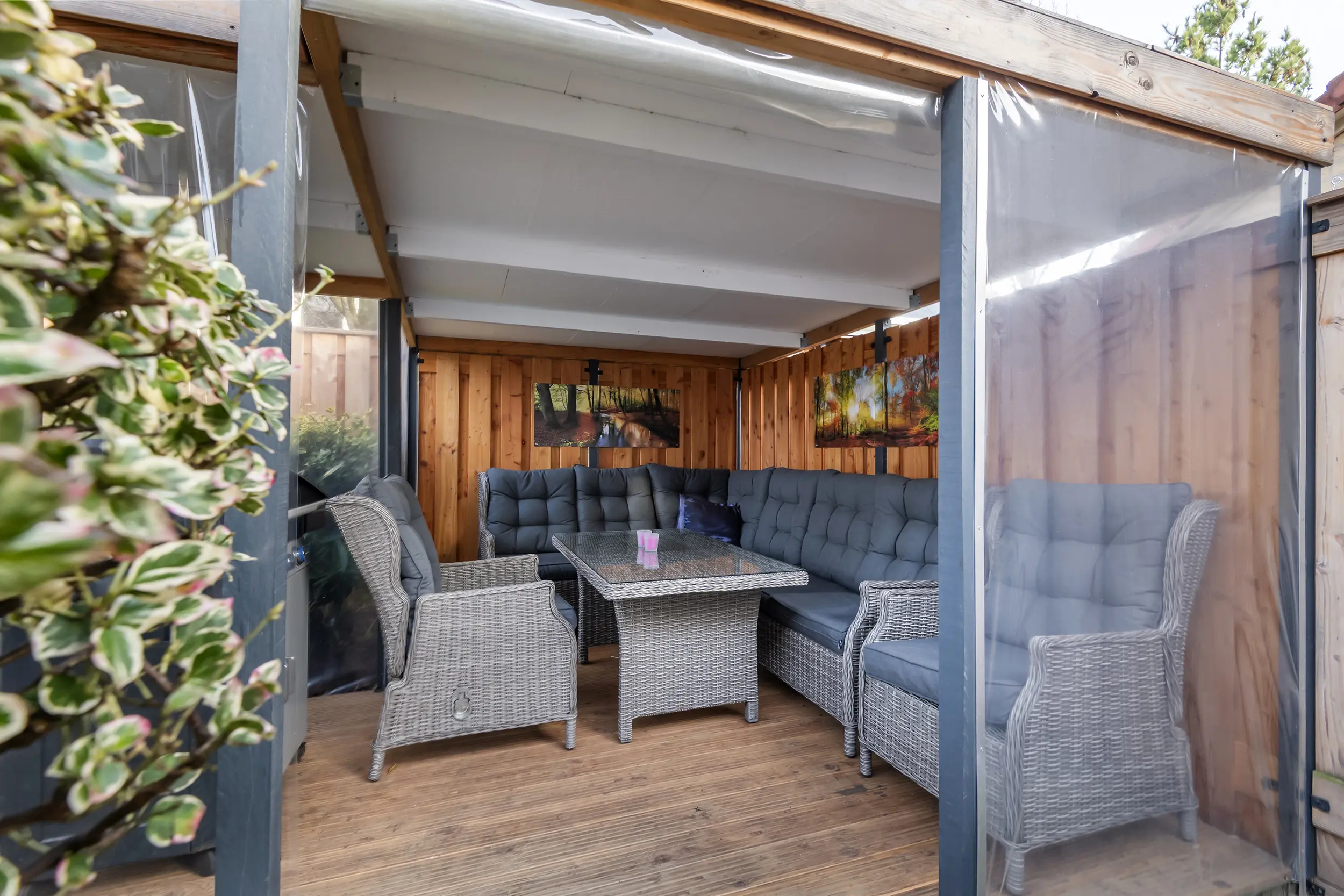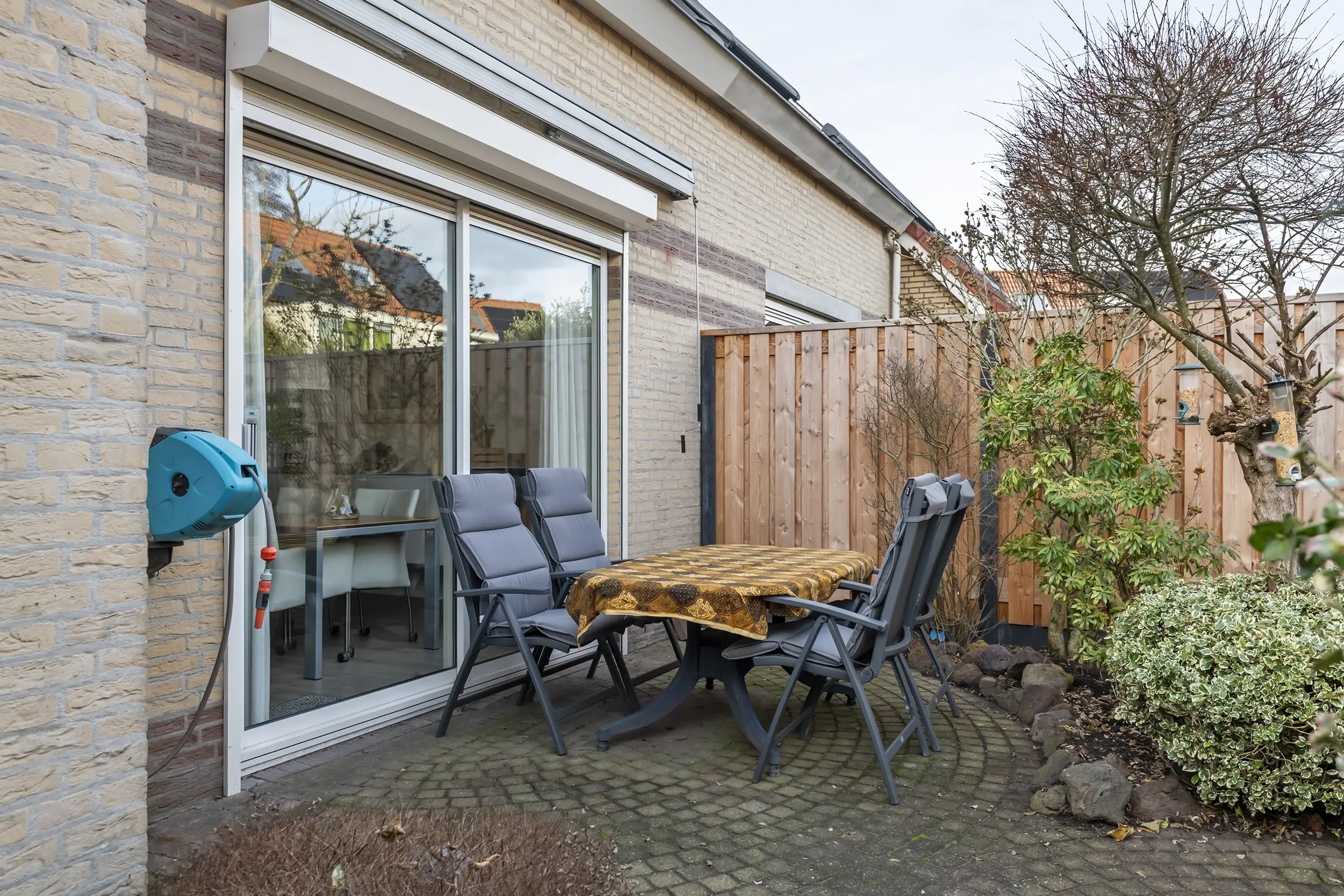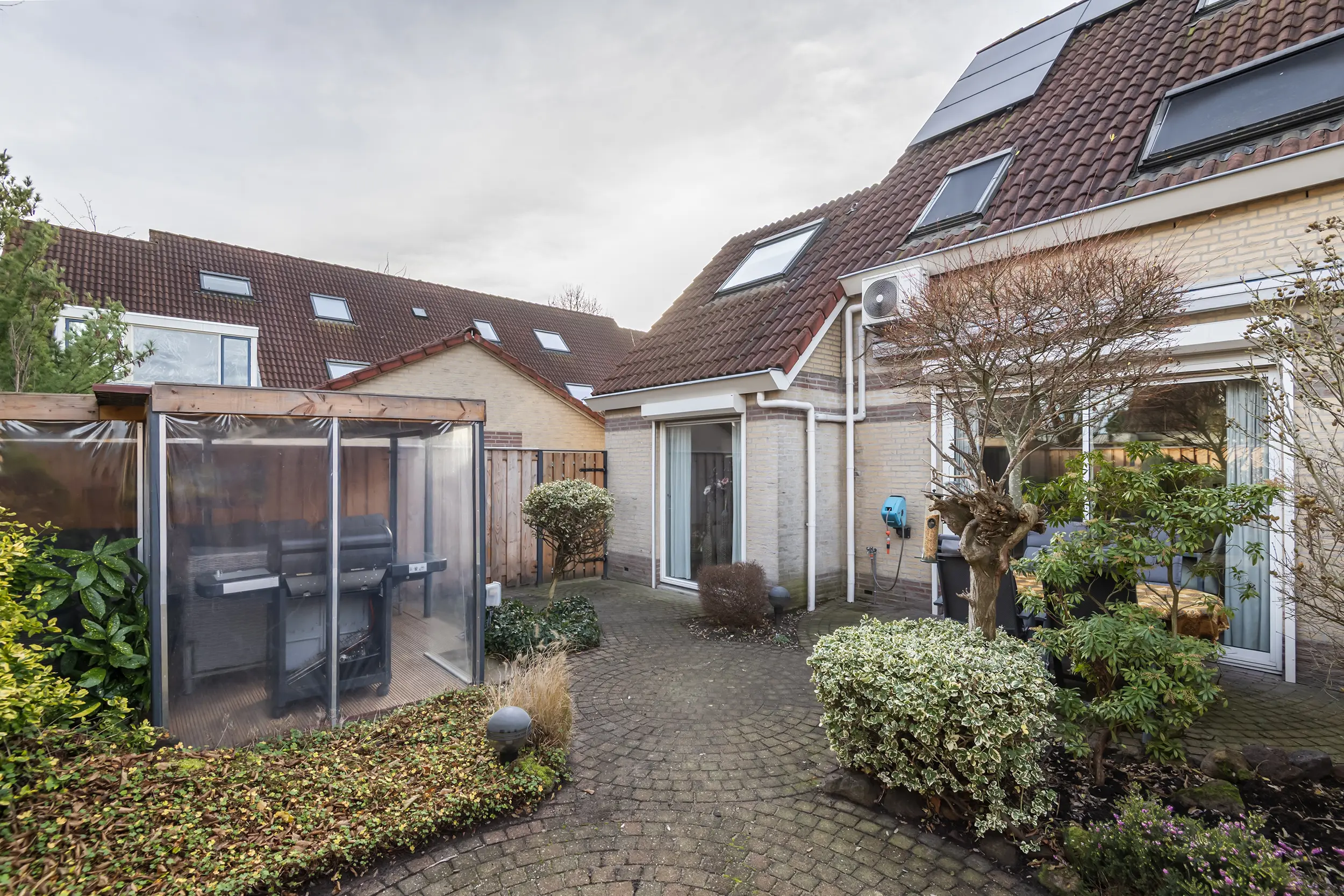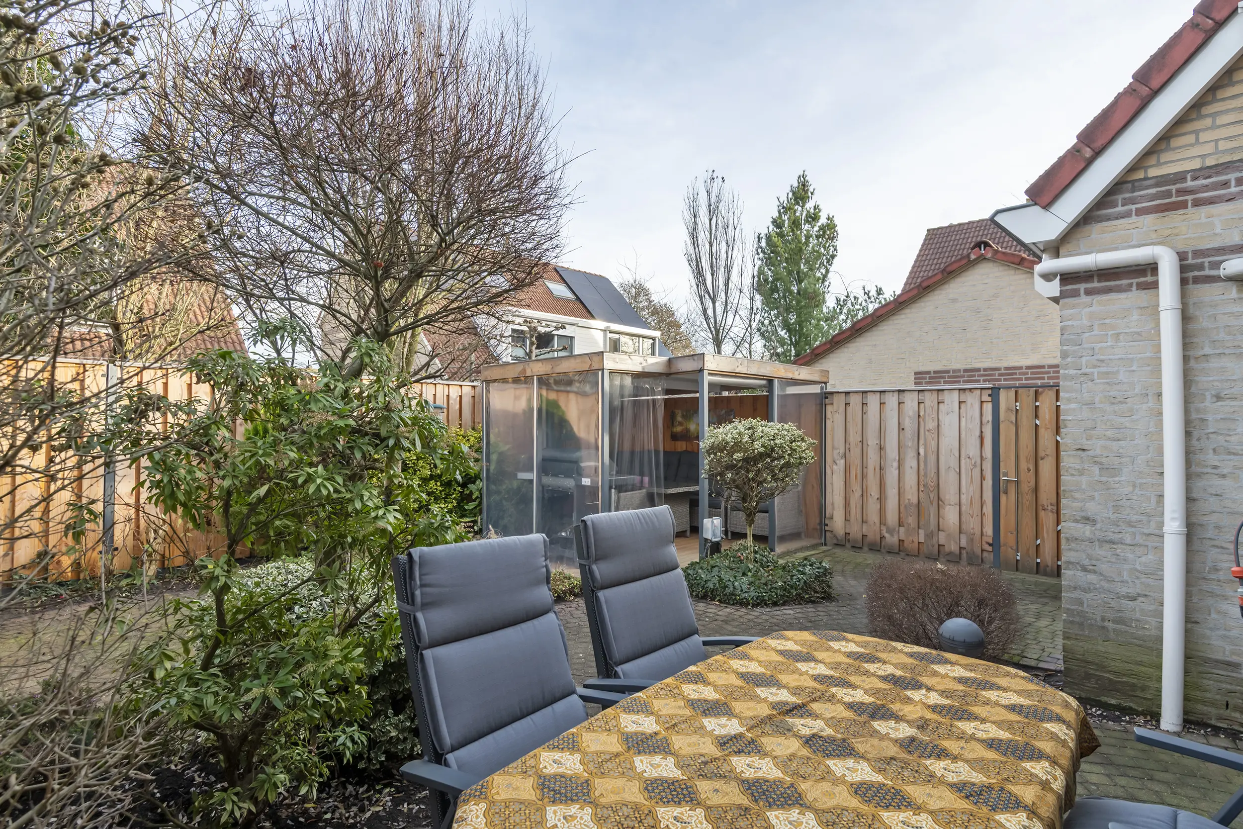 Ook buiten is het goed toeven. De achtertuin op het oosten is onderhoudsarm, voorzien van een overkapping en biedt zowel zon als schaduw. Een plek voor een rustig ontbijt, een goed boek of lange zomeravonden.