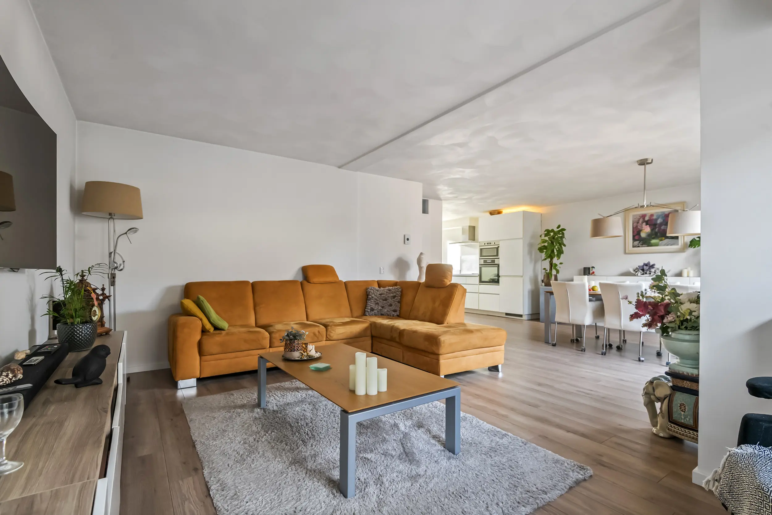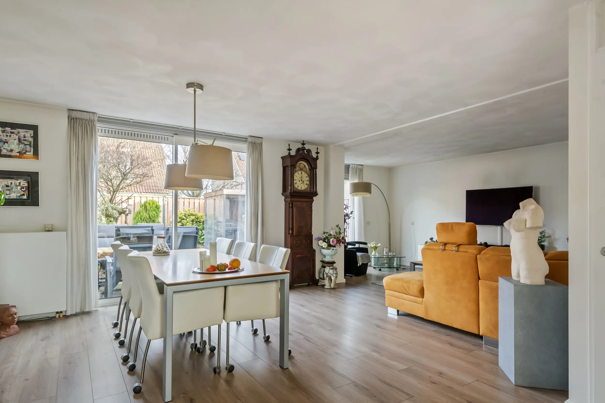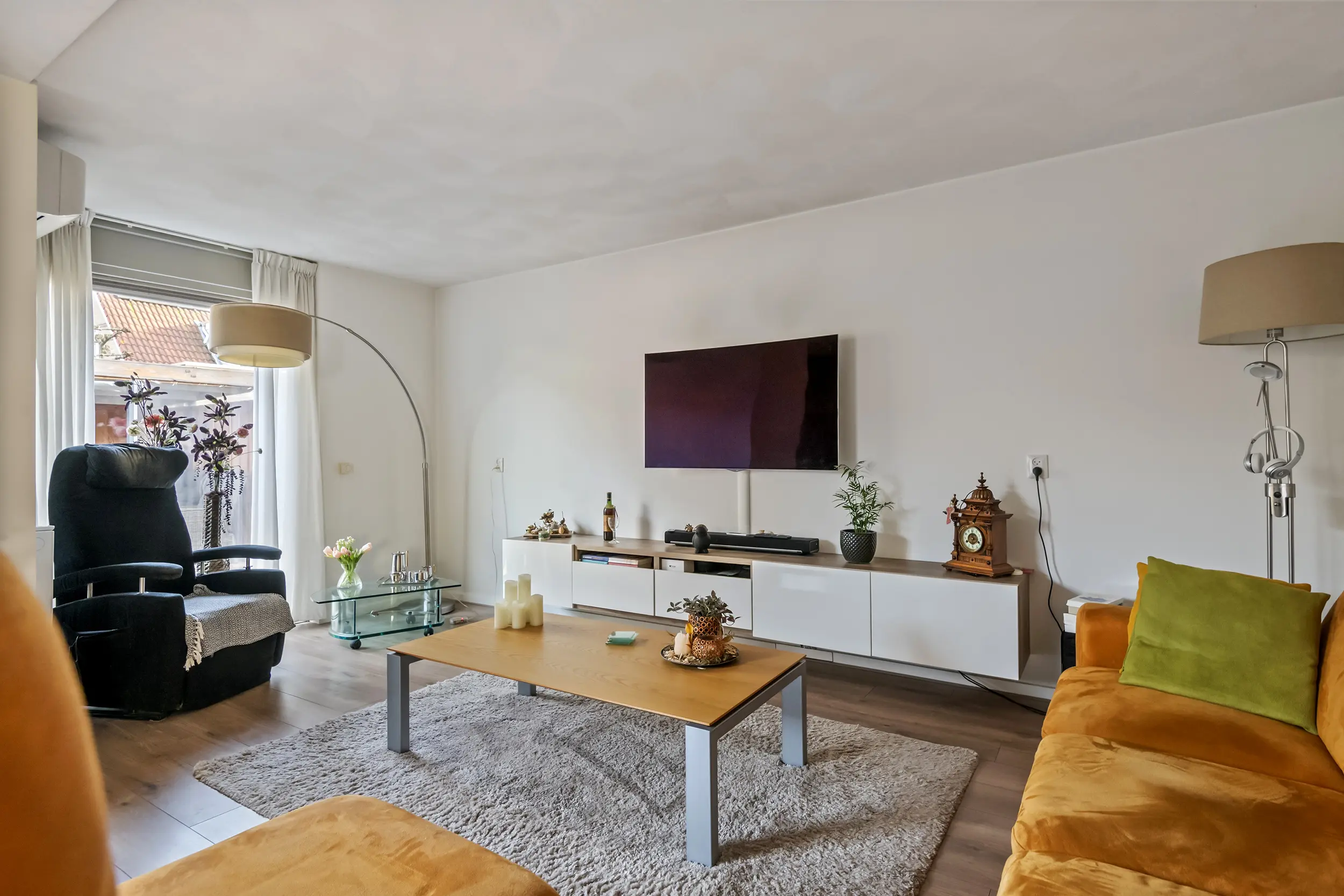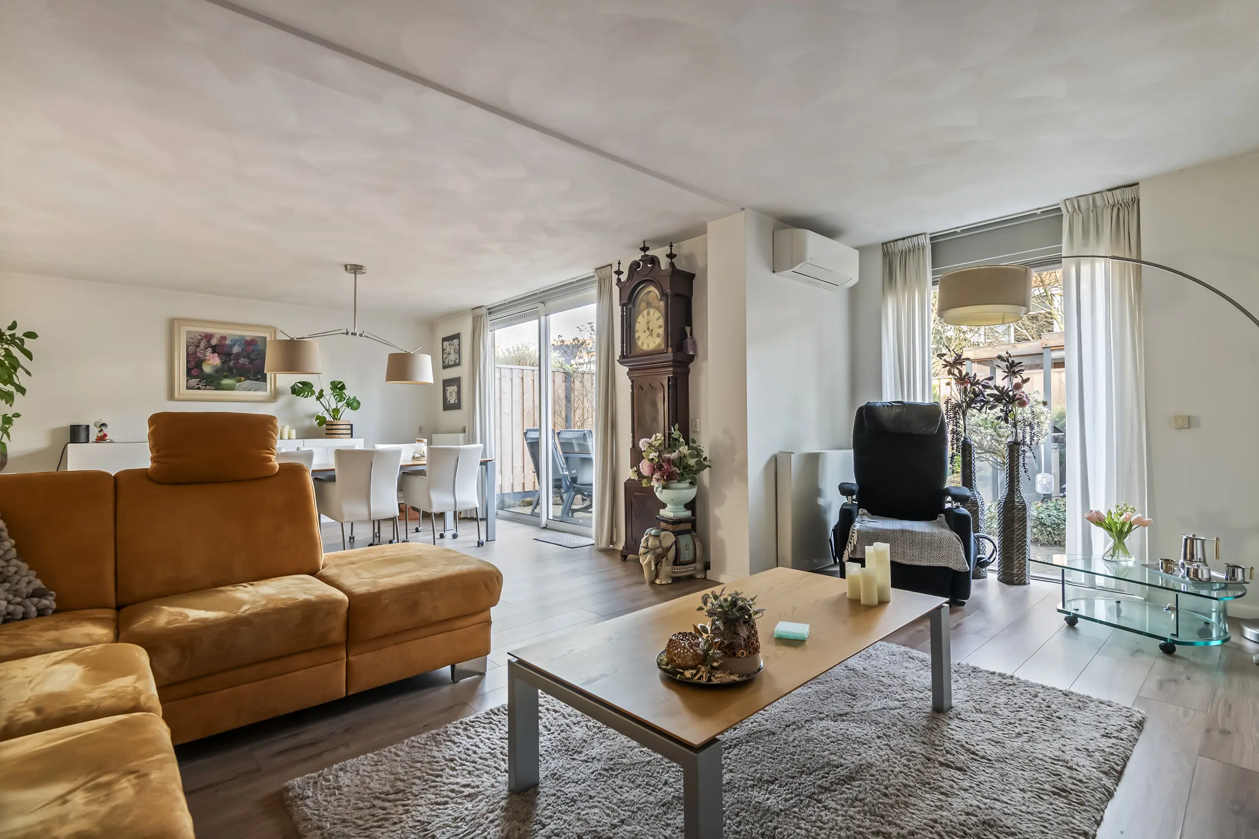De woonkamer vormt het warme hart van het huis. Ruim, licht en uitnodigend. De grote schuifpui laat het daglicht rijkelijk binnen en verbindt de leefruimte moeiteloos met de tuin. Of het nu een drukke werkdag was of een rustige zondag: hier kom je écht thuis. De airconditioning zorgt het hele jaar door voor comfort, in elk seizoen.